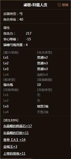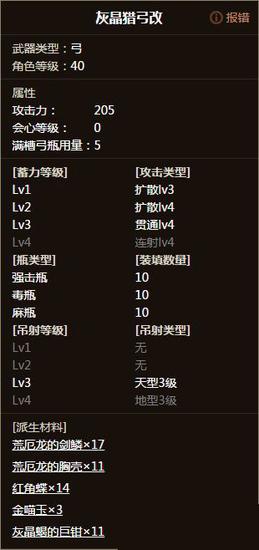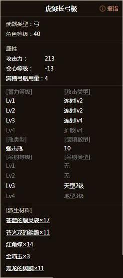 三蓄贯通弹种仅有灰晶猎弓和角龙弓,面板方面:灰晶猎弓205会心0,角龙弓217负会心15。作为弓箭第一面板的角龙弓其最大优势就在于217的面板开火高强化会造就极其可怕的攻击数字然而其最大的劣势也是延续了几代派生——弹种等级逗比。纵观所有顶级物理弓仅日珥弓和角龙弓三蓄是lv3弹种[可是人家日珥弓续航极好、吊射等级高装填可以拯救哇。]而且角龙吊射等级全部为lv2,就算是装填术也拯救不了。