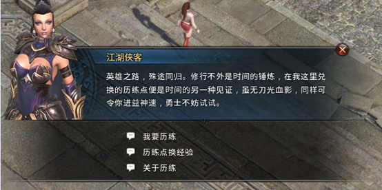 如果你有幸进去了,那么恭喜你,轻松了!接下来会教你游戏中是男人都会选择的一件事——选择“历练”系统(比奇、盟重安全区选择NPC江湖侠客对话)。