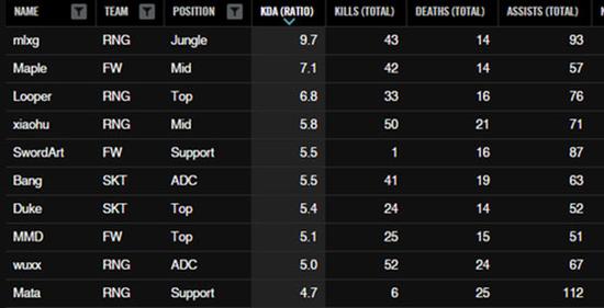 FW(闪电狼)的中单Maple表现优异,以7.1紧随其后,接着就是RNG的上野Looper&xiaohu。