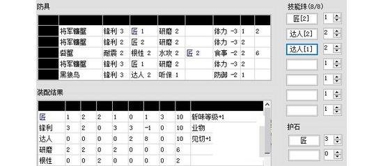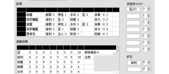 用匠护石的好处是在匠业物之余还能剩6个孔,可以考虑镶几个珠子加上零碎的技能点凑出极磨、见切1、根性、水属性攻击强化1、耐震中的一个。匠3和锋5的选择一般是根据自己的经济条件,毕竟匠3比锋5贵不少(以自己所在的区为准),同时多出来的副技能只起到锦上添花的作用。