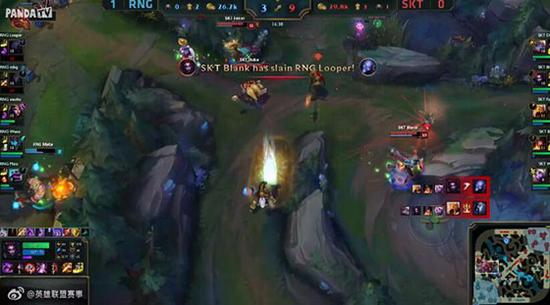 第二场一上来RNG还是延续了初期线上灵活强势的特点,中路小虎的妖姬率先拿到一血。然而很快,SKT在蜘蛛一波Gank帮助队伍下路打开局面,SKT ADC轮子妈和辅助相继拿到人头。Faker的沙皇在中路也成功单杀小虎妖姬。SKT全面占据场上主动。