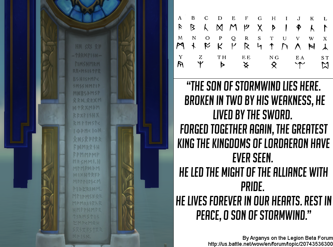 “暴风之子长眠于此,他以刀剑为生,甚至因为他的弱点被一分为二(人格)。 洛丹伦诸国有史以来最伟大的国王再次合二为一。他以荣耀带领联盟前行。他永远活在我们心中。安息吧,暴风之子!”