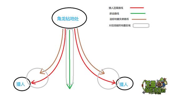 在了解了角龙的钻地攻击的流程之后,我们会发现共同之处为钻地、移动。但是在移动方面,分为定向移动、随机移动、追踪移动三种。为了区分这三种 我们需要首先要做到不贪刀,角龙钻地后与角龙保持一定距离。这个距离根据猎人的自身反应速度决定远近,如果觉得自己拿不准的当然越远越好。其次需要做的是 在跑离钻地点的路线上选择斜着跑,就是边跑边带点角度的类似于如图所示: