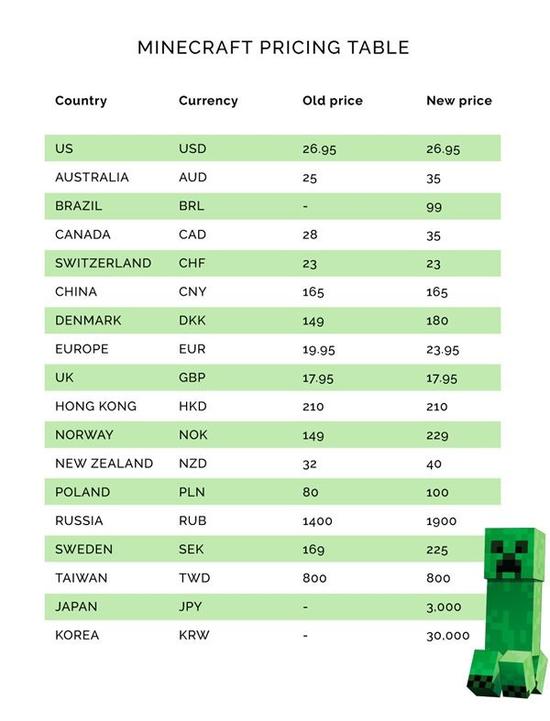 微软Mojang工作室今天宣布PC版《我的世界》从5月23日开始,由于美元汇率变化,在某些国家和地区售价会相应上调。另外,Win10/Win7 PC版《我的世界》也是首次登陆日本和韩国市场。