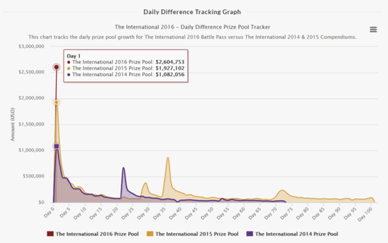 昨天晚上完美的充值出现问题,哪怕贴心的完美为保护水友们的双手果断的进行一波熔断,热情无可匹敌的Dotaer剁手的强烈意愿拦都拦不住,去国际服Steam购买也要入手小红本。就Ti6和Ti5的曲线对比,首日奖金的增长有一个明显的抬头。
