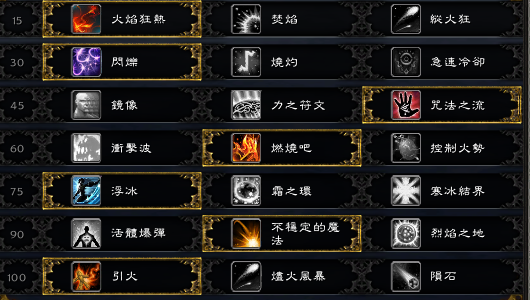 3. 因为确定了第七层天赋,那么一切增幅纵火效果的天赋也就相应的应该纳入优先考虑当中,它们包括:第一层的火焰狂热 (施放受法术连击影响的炎爆术 有10%的概率立刻返还法术连击);第四层的 烈焰飞扬(30秒冷却,立刻获得两层炼狱冲击)。