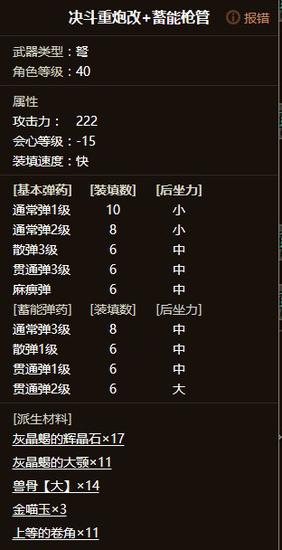 决斗---继承角挺的优秀,爆炸攻击力。全面的弹种,除了负会心。没有缺点。有麻痹弹,反动只需要 1。最大的优点是。你想派生到65并做好这套装备 只需要刷4个怪。尾晶蝎。灰晶蝎。角龙。苍火龙。套装绝对可以优化,但是我这样做绝对最省钱。我估计有人会吐槽角的问题。但是我想说。在漫长的刷角龙尾甲道路上。角迟早会有的。咱不是为了省么~~~富裕4个孔。可以降低你护石的要求。可以把见切变2.低耳可以应对火龙一家哦~~~