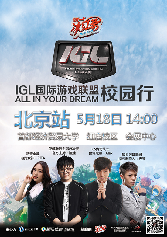 国内FPS游戏第一人ALXE,英雄联盟金牌解说WAWA,美女解说RITA,亚洲男神天策,众多电竞明星莅临IGL北京校园行现场,与众多学子分享自己的电竞生涯;还有花样水友赛,与大家一起欢乐无限。
