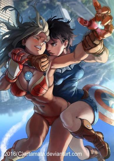 下图为艺术家@Artamata 的设计,身穿比基尼的钢铁侠与中性风的美国队长近身肉搏,也是肉感十足啊。