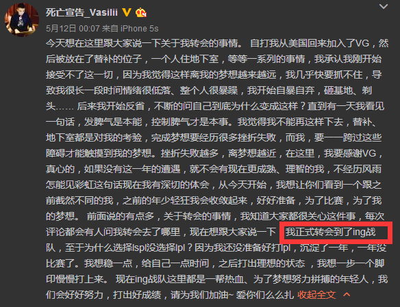 死亡宣告微博宣布转会甲级战队ing,经历一年的蹉跎之后。死亡宣告选择甲级队伍,是非常明智的一件事。毕竟一年的时光,没有在登赛事舞台,所以从甲级舞台开始往上打,是非常不错的一个选择。不仅能够在技术层面慢慢适应,也能让自己的心态不断适应。而对于ing战队,死亡宣告的经验,对这支甲级的年轻战队有帮助的。希望宣告这名老将,在未来能够有一个好的归宿。