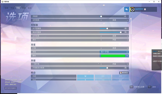 然后就是控制选项,守望先锋的设置很友好。可以设置总的灵敏度,水平灵敏度和垂直灵敏度,这里推荐大家把垂直灵敏度调高一点。 因为鼠标垫和人手移动的关系,垂直移动要比水平移动的距离短很多,守望先锋是一个比较立体的FPS游戏,经常会出现高空目标和低地目标,垂直移动是比较经常的事情。