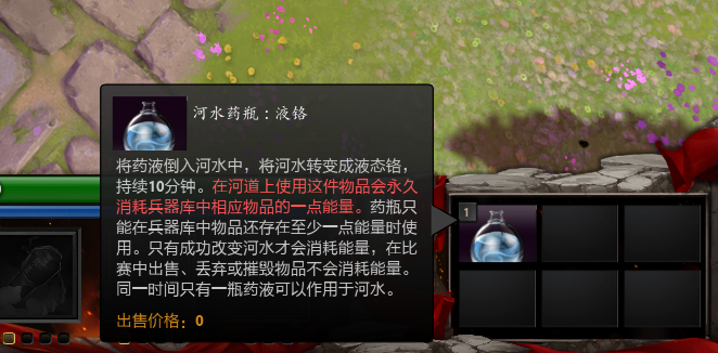 河水变成了红色……或者绿色或者紫色!从勇士等级85级开始,将获得神秘的河水药瓶,可以让英雄在比赛中改变河水的实质和颜色,效果对所有人可见。药瓶在游戏内商店领取后可以装备在英雄身上,并且无法对已改变的河水使用。勇士令状等级提升时不仅可以入手新型药瓶,而且之前药瓶的能量也会恢复。每瓶药水有十点能量,每次使用可以持续十分钟。终极药瓶可以让河水变成血红色,2500级时入手,拥有50点能量。