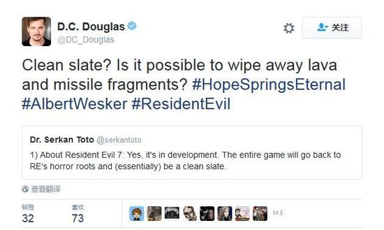 近日曾经为《生化危机》中大反派威斯克配音的D.C.Douglas,近日转推了知名报料人Dr。 Serkan Toto关于《生化危机7》的一条消息,并且评论道:“清理掉石板?或许还抹去岩浆和导弹破片?”此前他还上传过一张为某日本游戏配音的推文,所以,或许威叔并没有死。
