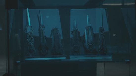 之后林奇立即被绑上了最新款的Animus上,这台机器能够让使用者通过“基因记忆”追溯到他的祖先。虽然他正被五花大绑,但我们的视线已经被吸引到画面右边陈列的一排袖剑上。