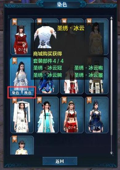 点击染色,进入染色模式,已经收藏的时装,鼠标放上去会出现染色和换色按钮。