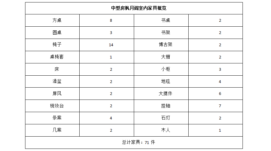 枫月阁可摆放家具、摆件古董等总记为112件。以下为家具详情