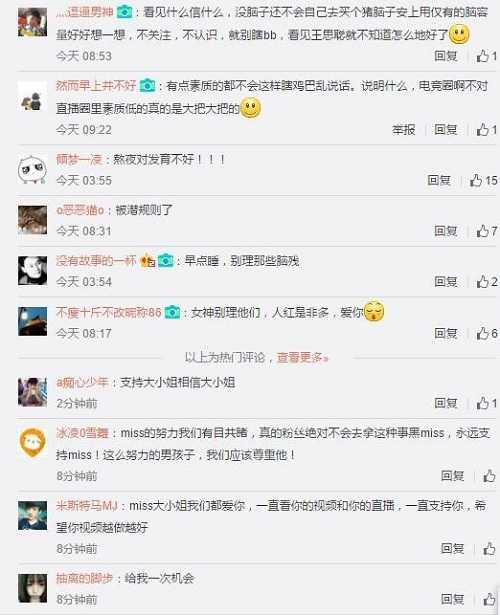 而后证实校长的确在直播里说过这样的话,不过到底是真是假就没人知道了。于是很多键盘侠就纷纷在miss的微博下留言,并且用语也十分的低俗,而miss在知道此事之后,也是接连澄清此事: