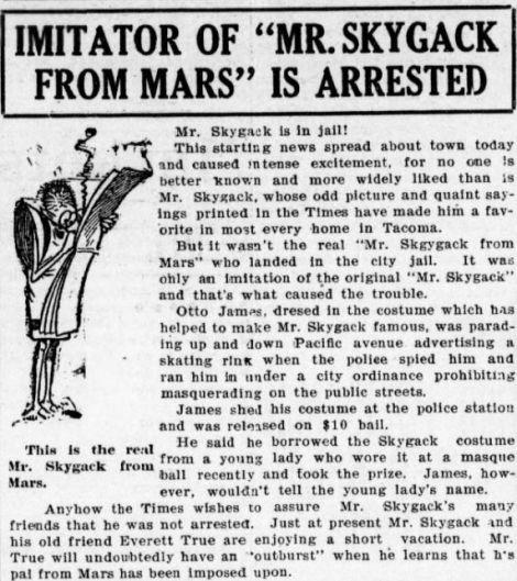 在1907年,漫画家A.D。康多开始将精力集中在他的新作《来自火星的斯盖凯克》(Mr。 Skygack, from Mars)上。这是一个关于外星访客“斯盖凯克”在地球上定居、它在生活中所遇到的笑话还有其观察到的一些人类奇特行为的故事,有关该角色冒险的故事屡屡见诸美国各大报纸,掀起一阵狂潮。