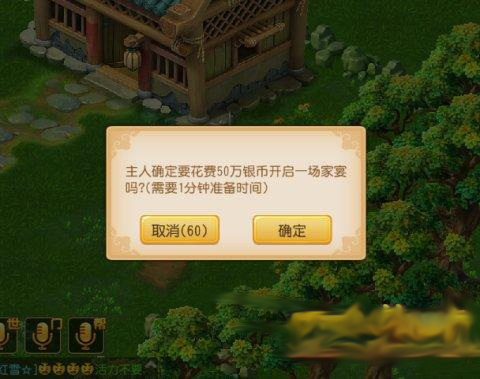 一、创建一个号每天无聊的时候做做日常即可,赚的银币购买一个最差的民宅(一百万银币),然后在家园中点击护院,花费五十万银币来举办家宴,只邀请自己常玩的号进去参加。