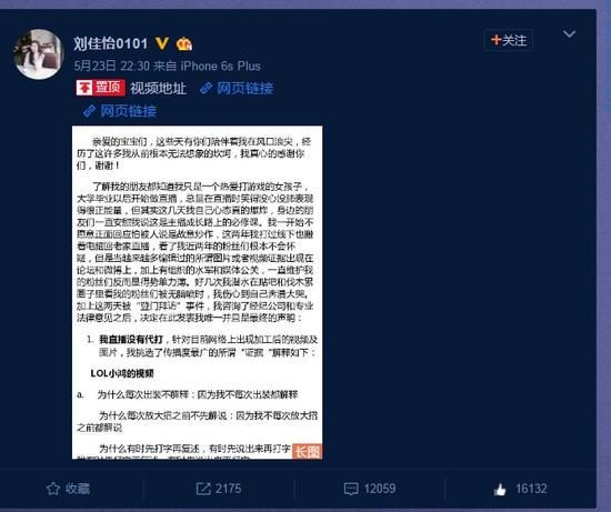 5月23日晚,阿怡在微博发了一条长微博澄清,否认代打,并她称自己手速300+,在身体摇晃时鼠标点天赋不是延迟,就是自己点的,因为视觉死角导致大家误会。