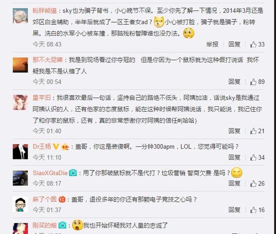 但是阿怡这条澄清反而招来了更多质疑,连唯一顶她的人皇sky也一起下了水。网友纷纷表示sky为了营销鼠标也是拼了,从此人皇晚节不保,300+的手速更成为了一个笑话。