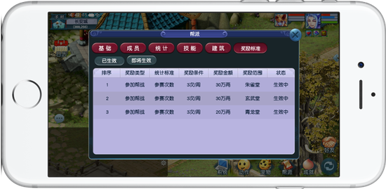 玩家可在“奖励标准”中查看参与指定帮派活动的奖励详情