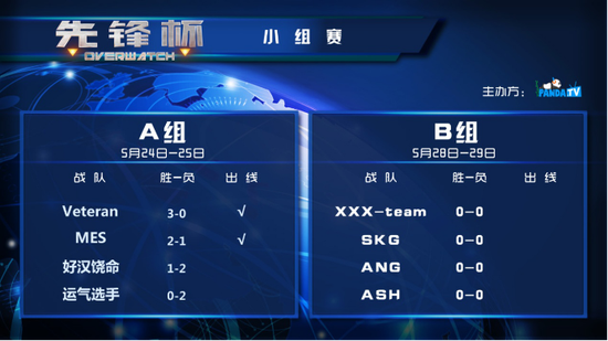 由熊猫TV主办,全国第一个《守望先锋》比赛先锋杯,于5月24号晚上8点拉开序幕,在昨天晚上结束的A组小组赛中,老干部(VETERAN)和MES晋级4强淘汰赛,而运气选手和好汉饶命被淘汰。本周六晚上将开始B组小组赛,敬请期待!
