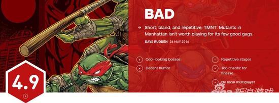 近日IGN对动作新游《忍者神龟:曼哈顿突变体(Teenage Mutant Ninja Turtles: Mutants in Manhattan)》进行了打分,最后只给出了4.9分的差评,IGN认为这个游戏太无聊了。