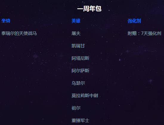 庆祝活动期间商城将上架折扣幅度巨大的一周年包,为大家带来更丰富的英雄选择。礼包内容如下: