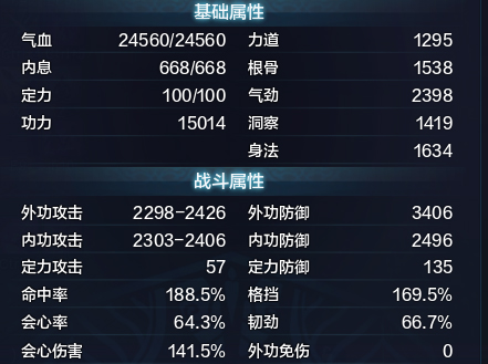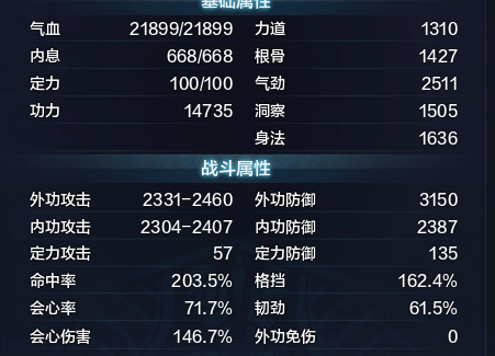 有个低吟和破阵子,其他没有任何BUFF,算是现在的常驻状态,心法是拜月冰心第一本8重满穴位+所有内功穴位点满,风华玉碎第二本8重穴位满,练武气劲 第三本7重穴位+气劲穴位满(目前正在点,准备后期放第二代替风华),罗睺绝第四本7重穴位差一个恒赋5其他全满,这应该是现阶段非神豪玩家能用的肉奶兼 顾的最佳心法了。在说下附魔和石头方面,我石头用的是三角紫色双全,方的3天行5,2血守5,1韧守5,圆的4恒敏5,2恒赋4,从我的五围大家可以看出来都很高,我全身FM几乎全是气劲身法根骨洞察的五围,这个可能是强迫症使然,因为不喜欢直接加属性的,可能是从别的游戏受的影响把。