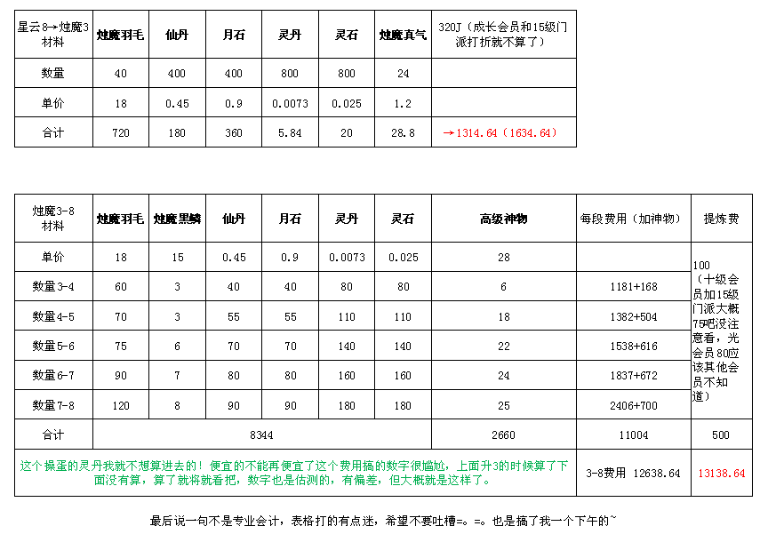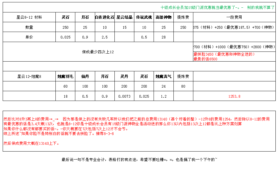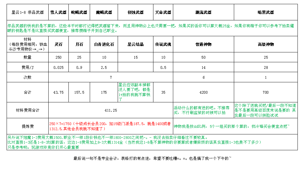 感觉问的人并不多,好多人也很盲目到底怎么做武器才会比较划算,盲目跟乱来可能会导致乱花很多钱,辛苦我一下午码了表格分享给吧友。二楼上图,顺便鼓励下自己的烛魔15梦。
