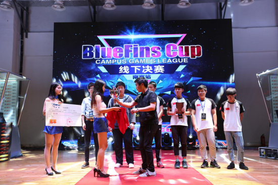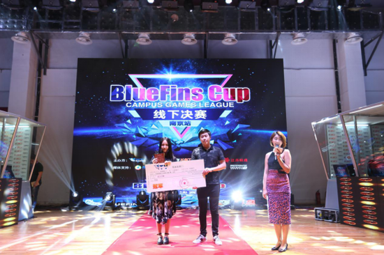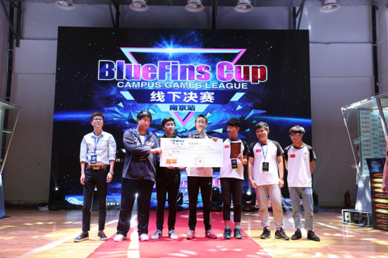 在水友赛结束后,White55开亲自为首届蓝鳍杯高校电竞联赛——南京站冠军颁发冠军奖杯、荣誉证明以及现金支票。