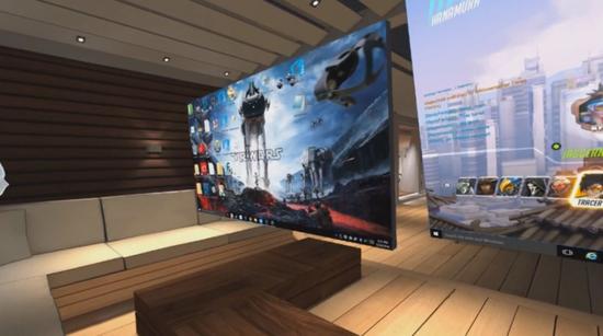 BigScreen能把用户传送到各种各样的VR房间,还能把用户的电脑屏幕搬进VR房间,现实世界里你的电脑屏幕上显示什么,VR房间里的屏幕就显示什么,所以尽管《守望先锋》不是VR游戏,也能搬到VR世界里。