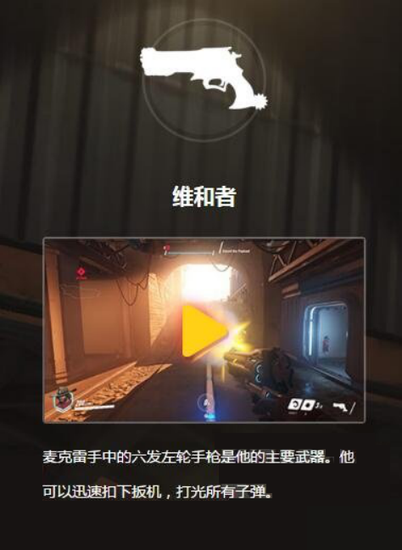 就像西部片里面牛仔标配柯尔特左轮手枪一样,麦克雷的武器也是左轮手枪,而这把维和者的性能明显太过优秀,除了载弹量以外没有任何明显缺点,左右键攻击互补,让麦克雷有能力灵活应对各个距离的敌人。