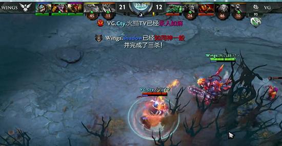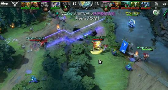 首场比赛双方都拿出了一保四的阵容,二冰操刀一号位露娜,前中期两队打出了镜像似的比赛,一开始双方四核拼发育,三条线各占一个人,野区还有一个,VG1比0结束对线期。稍后蝙蝠军团同时跳刀,两队又分别利用节奏点开雾抓人,杀人拿塔,但彼此都没有建立起优势。之后熊德辉耀,露娜蓝杖,不过蚂蚁也林肯暗灭,两队又开始打正面团,几波交手下来,人头几近持平,经纪也相差无几。36分钟,人头14比13,WINGS领先,但VG拿了盾,并直接中路一波上高,WINGS不愿在高地坐以待毙,主动绕后想打先手,结果没想到被对方的视野看的一清二楚,潮汐开大秒了军团,VG趁势推高,露娜刷新A仗虚灵刀在对面BKB面前完全没打出伤害,VG轻松杀了露娜,WINGS打出GG。