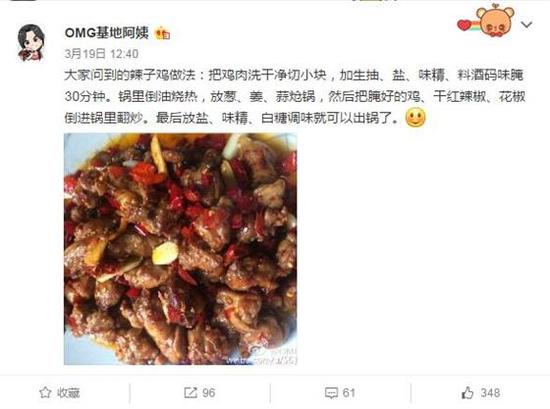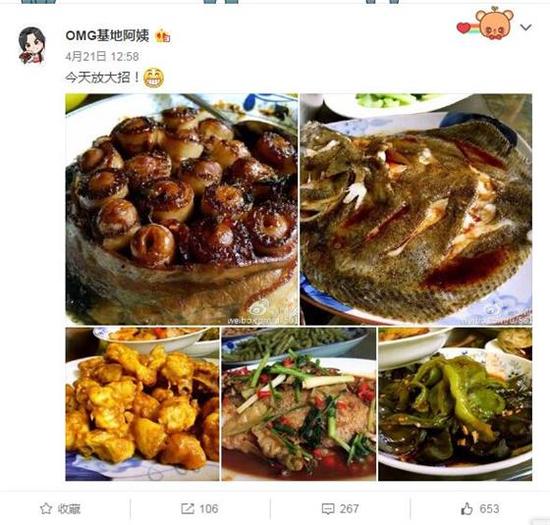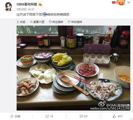 首先吸引小编注意的是OMG的基地煮饭阿姨开了属于自己的微博。 这开了微博以后煮饭阿姨每天都在晒OMG基地的美食!
