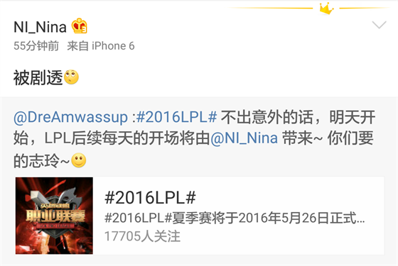 大家还记得春季赛总决赛时台上那位气质非凡,神似志玲姐姐的女主持人吗?她叫Nina,是香蕉计划的女主持哦,沉寂了一段时间的她被爆料将主持6月2日LPL夏季赛的开场环节: