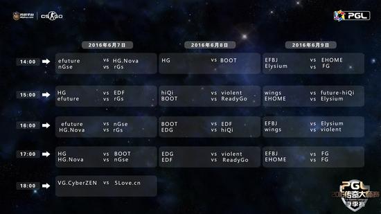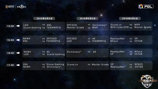 PGL中国区预选赛采用小组积分赛后双败的方式决出晋级线下总决赛的晋级名额,小组赛阶段共分为A,B,C,D,E,F,G,H,8个小组,每个小组4支队伍,进行BO1循环赛,每场胜利的队伍积1分,失利的队伍积0分,每组前2名出线,若出现积分相同则首先看胜负关系,如果2队胜负关系相同则与排名更高的队伍比较胜负关系,如果仍是相同则采取BO1加赛。出线后的16支队伍再次进行小组赛,分A,B,C,D.4个小组,每组4支队伍,进行BO1循环,每组前两名出线,出线后的8支队伍进行双败淘汰赛,决出2支队伍晋级线下总决赛。PGL2016《CS:GO》预选赛对阵时间表