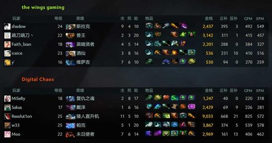 47分钟,带盾的DC佯装推中,骗下剧毒的棒子后,推进没有棒子的上路高地,拆掉近战兵营后转下路,输出严重不足的Wings在最后一搏失败后打出GG。DC战队的Resolutin操刀的小狗以15杀0死8助攻拿下了本场比赛的MVP。
