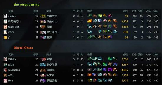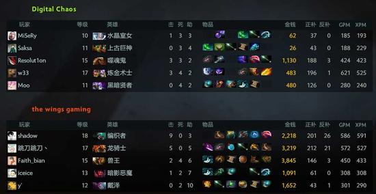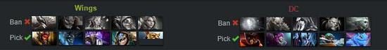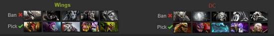 在BO3的第一局中,双方互BAN绝活,Wings选出了与之前ESL与Liquid争冠时类似的炼金剧毒体系配合控制兽王、海民和奶妈戴泽,而DC则选出了小狗、卡尔、DS和冰龙、LION双辅助。