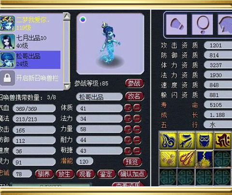 首先我们来看看这个7技能须弥泪妖胚子,体力资质3237,法力资质1930,成长1.188,资质和成长不算高,但是技能多,有须弥,吃元宵来弥补,老板也打书心切,直接先上了一本高法连。