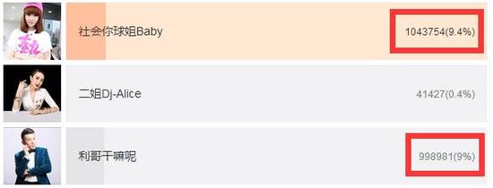 第一名则是赵本山的网红女儿妞妞,以104万的超高得票数居榜首。果然本山大叔亲自出马为女儿拉票,影响力非凡呀。