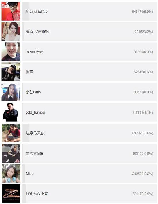 但是这些在游戏圈红得发紫的主播们到了这样的场合似乎显得有点人气不足,进入前十的,只有第八名的LOL主播若风和第十名的骚男。