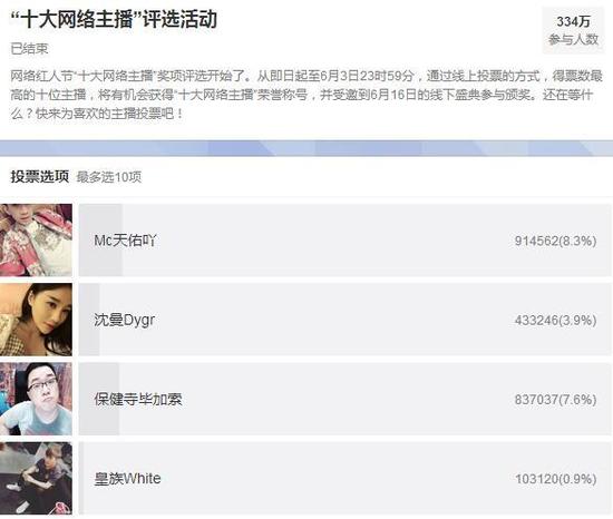 近日,微博上“十大网络主播”的投票评选活动落下帷幕,334万网友参与投票选出了自己最喜欢的主播。