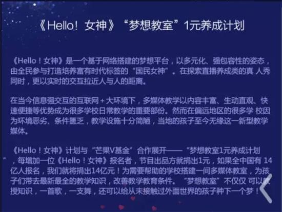 但是当节目的慈善合作方“芒果V基金”代表上台,宣布《Hello!女神》的所有善款都将用于“梦想教室”养成计划,为山区的孩子搭建多媒体教室,改善他们的教育条件时。小编也是被这个自称“年少轻狂,口无遮拦”的国民老公暖到了。原来,在玩世不恭的外表下,老公有着一颗如此温暖的心。熊猫TV是互联网企业,而这档节目也极具互联网思维。网络正改变着这个世界,山区的孩子理应通过互联网看到更大的世界。