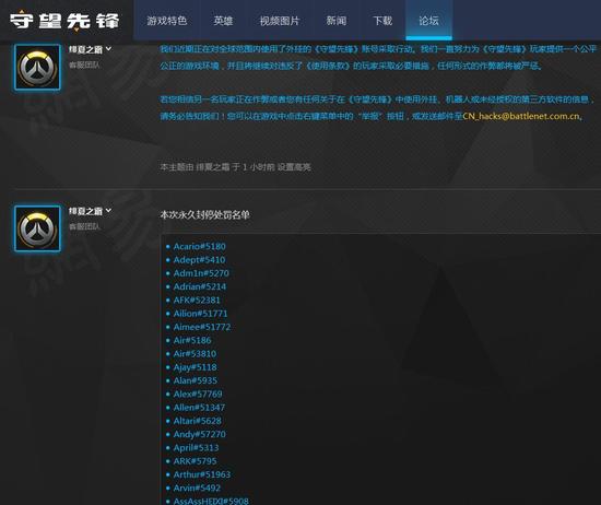 暴雪对待游戏外挂的态度一向严厉,早在暗黑2时期就大批封号,而且多次和外挂制作者对簿公堂。现在国服《守望先锋》也对此问题进行了处理并公布了封禁账号的名单(点击查看详细名单)。从名单上来看,本次遭到永久封禁的玩家数量高达1572名,受到30天与90天封禁的玩家也有不少,这个场面只能用触目惊心来形容了。
