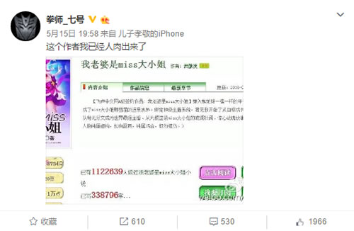 七号和Miss两人从很早就认识,在早期MISS刚从职业选手转型解说之际,7号就用自己的言传身教来帮助渡过最艰难的时期。七号对Miss这位老友也是操碎了心,之前还贴出一本名为《我的老婆是Miss大小姐》的书来为Miss寻亲。两人微博互动频频,网友也是看热闹不嫌事大,竟然对着七号高呼:“不要搞基!”大小姐真是个好男儿啊!