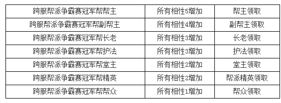说明:如果某帮派跨服帮战的奖励与本区组帮战胜利的奖励同时获得,那么只算跨服帮战奖励的个数,不累加计算。