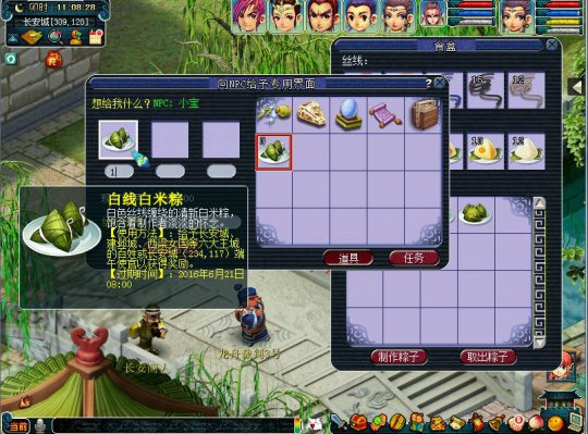 完成环任务的过程中,三界众生将赠予你“端午食盒”用以储藏任务中获得的半成品粽子与各色丝线,每个半成品粽子与一条丝线搭配,可以制作出货真价实的美味粽子,将这些粽子赠予长安城、建邺城、傲来国、长寿村、朱紫国等地的三界百姓,可以获得他们的答谢礼。特别地,部分百姓对某种粽子有特别的偏好,问清喜好再送粽子可能获得意外之喜哦。如果少侠你懒得跑腿,也可以把粽子直接交还给端午使官,然而跑腿费什么可就没有啦!