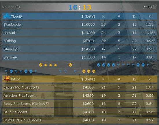 下半场开始时,天禄又是迅速出击拿下了小三连。然而就在大家认为天禄只要稳扎稳打就可以取胜的时候,天禄队员自信膨胀,竟然想用刀杀对手,结果导致开局不利被对手拿下。后边的比赛天禄一蹶不振,C9很快将比分劣势缩进并反超。天禄再也找不到拿分的节奏,最终C9以16:13的成绩拿下了本场比赛的胜利。
